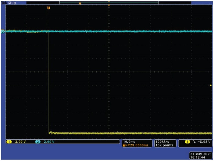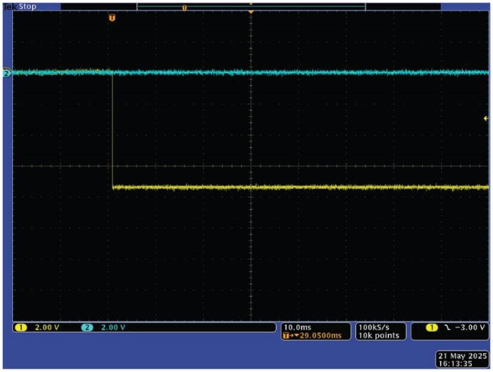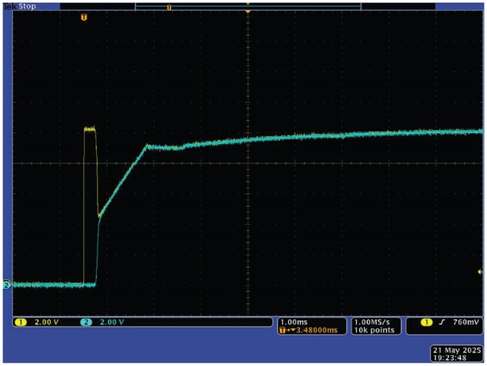 圖3顯示了施加10 V階躍時電路的響應。黃色曲線為輸入電壓,藍色曲線為輸出電壓。斷路閾值設置為12 V,因此輸入電壓幾乎沒有壓降地傳遞到輸出端。