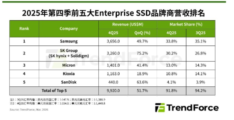 TrendForce集邦咨詢: 2025年第四季度全球前五大企業(yè)級SSD營收季增超50%