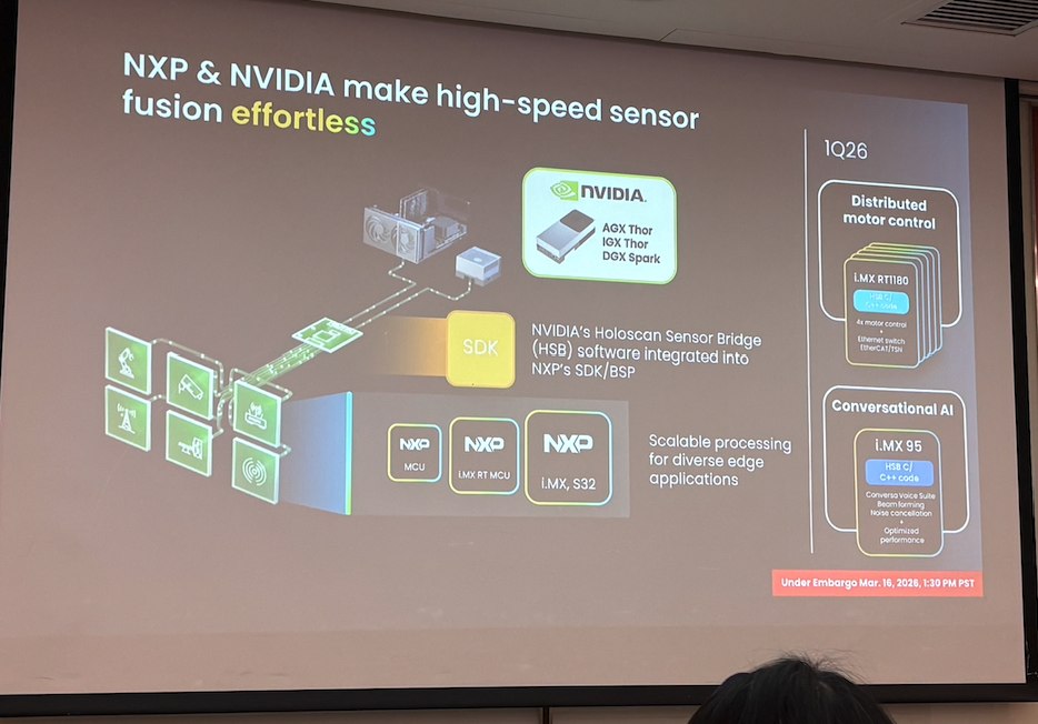更重磅的是與英偉達(dá)的合作:將NVIDIA Holoscan Sensor Bridge(HSB)軟件集成進(jìn)NXP SDK/BSP,實(shí)現(xiàn)傳感器數(shù)據(jù)實(shí)時(shí)直達(dá)機(jī)器人“大腦”。首批兩款解決方案包括:i.MX RT1180的分布式電機(jī)控制(4x電機(jī) + 以太網(wǎng)交換機(jī) + EtherCAT/TSN)與i.MX 95上的對話AI應(yīng)用(Conversa Voice Suite、波束成形、噪聲消除)。此外,恩智浦還提供有線/無線網(wǎng)絡(luò)(TSN、Wi-Fi 6等)、電池管理(MC33771)、安全元件(SE50x)、ROS2中間件與Conversa語音套件,形成端到端機(jī)器人解決方案。