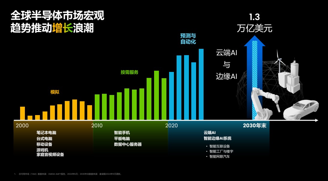 過去十年,半導(dǎo)體市場經(jīng)歷了從“模擬”時(shí)代到“按需響應(yīng)”、再到“預(yù)測與自動(dòng)化”的三次驅(qū)動(dòng)浪潮,而2030年市場預(yù)計(jì)將達(dá)到1.3萬億美元,其中云AI與邊緣AI共同構(gòu)成了下一波核心驅(qū)動(dòng)力。