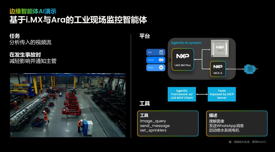 實(shí)際演示中,基于i.MX 8M Plus、MCX A與Ara-2的工業(yè)現(xiàn)場監(jiān)控智能體,可實(shí)時(shí)分析視頻流,在爆炸或火災(zāi)場景中識別事件、發(fā)送通知并啟動(dòng)灑水裝置(工具包括image_query、send_message、set_sprinklers)。視頻AI由Wan2.1生成,但系統(tǒng)全部運(yùn)行在邊緣。