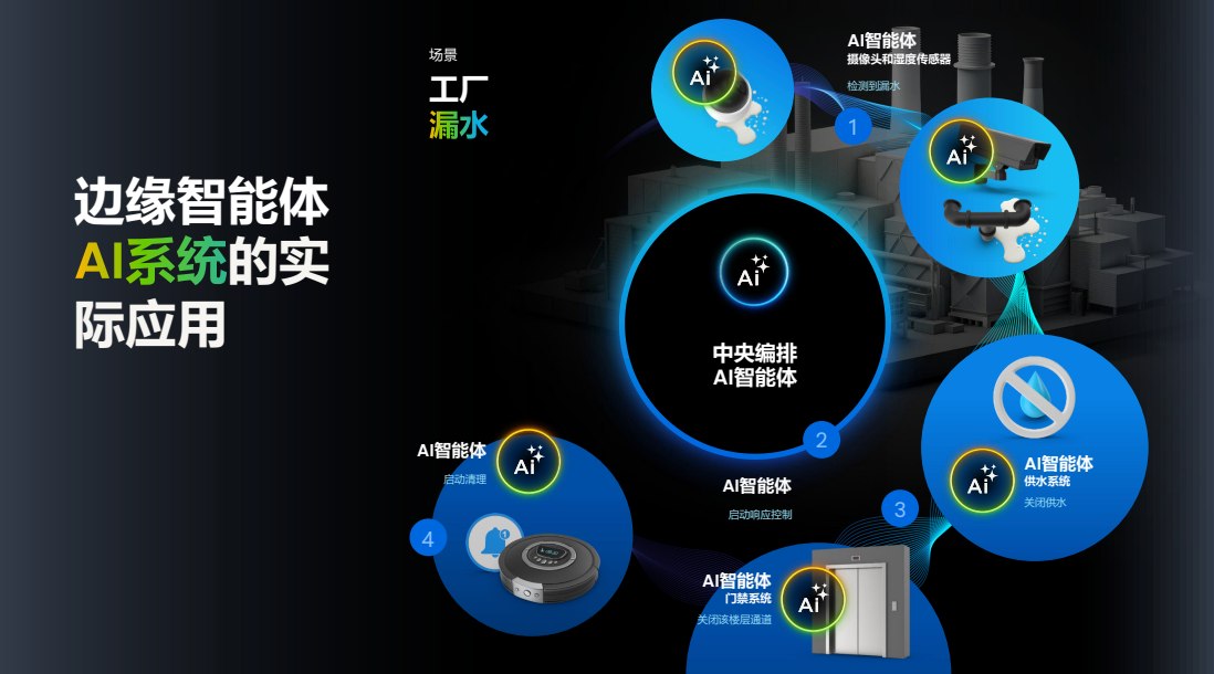 以工廠漏水場景為例:AI智能體通過攝像頭與濕度傳感器檢測異常,中央編排智能體隨即觸發(fā)關(guān)閉閥門、鎖定門禁、啟動(dòng)清理等一系列本地動(dòng)作,無需云端。