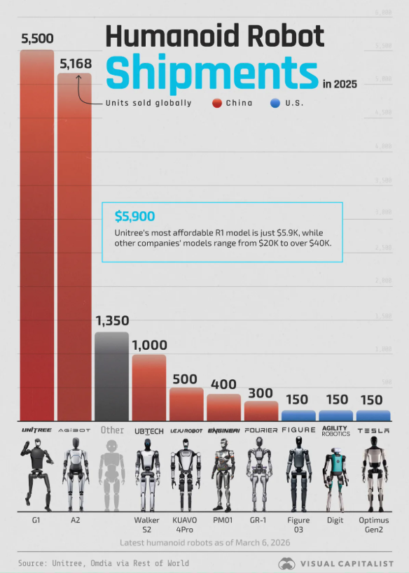 從企業(yè)出貨量份額來(lái)看,中國(guó)企業(yè)表現(xiàn)突出。根據(jù)中國(guó)電子報(bào)發(fā)布的《2025年人形機(jī)器人市場(chǎng)研究報(bào)告》,宇樹(shù)科技(Unitree)出貨量和市場(chǎng)份額在全球排名第一,2025年出貨量超過(guò)5500臺(tái)。此外,宇樹(shù)科技的產(chǎn)品在技術(shù)上也位居世界前列,價(jià)格也相對(duì)親民。例如,其最便宜的R1型號(hào)售價(jià)僅為5900美元,而該公司還出售售價(jià)1600美元的機(jī)器狗。