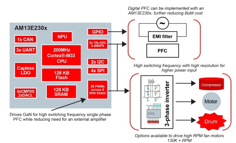 工程師可以使用 AM13E230x MCU 來優(yōu)化洗衣機電機控制設計——通過運行 AI 模型持續(xù)實時監(jiān)測電機負載,并根據(jù)衣物重量自動調(diào)整扭矩和速度曲線,從而防止電機應變。圖 2 展示了使用 AM13E230x MCU 的洗衣機電機控制系統(tǒng)的簡化方框圖。