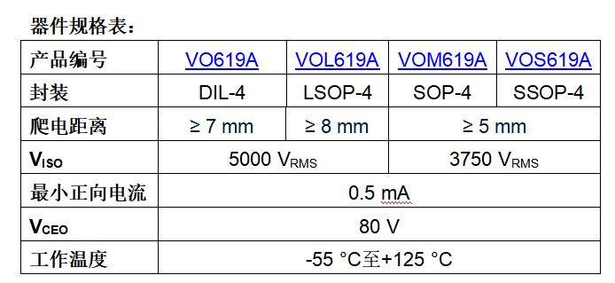 VOx619A系列器件配備了一個(gè)與光電晶體管檢測(cè)器光學(xué)耦合的紅外發(fā)射二極管。 DIL-4和LSOP-4封裝的光耦合器提供了高達(dá)5000 VRMS的最大額定隔離電壓,爬電距離和電氣間隙分別為≥ 7 mm和≥ 8 mm。SOP-4和SSOP-4封裝的器件提供更緊湊的選項(xiàng),以節(jié)省電路板空間,同時(shí)提供3750 VRMS的電壓隔離,爬電距離和電氣間隙≥ 5 mm。這些光耦合器符合RoHS標(biāo)準(zhǔn),無(wú)鹵素,滿(mǎn)足Vishay綠色標(biāo)準(zhǔn)。