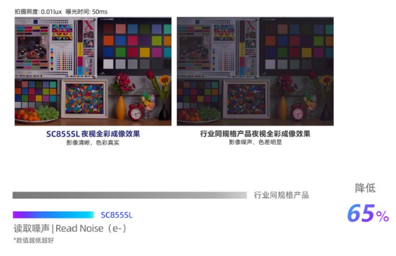 SC855SL搭載SFCPixel®創(chuàng)新技術(shù),支持CMS2、CMS4相關(guān)多采樣模式以及12bit量化模式,實現(xiàn)了噪聲的顯著降低。在常規(guī)模式長曝光高增益條件下,其讀取噪聲(RN)僅為0.63e-,較行業(yè)同規(guī)格產(chǎn)品大幅降低約65%,能夠幫助黑光全彩攝像頭獲得更加細膩清晰的夜視成像效果。