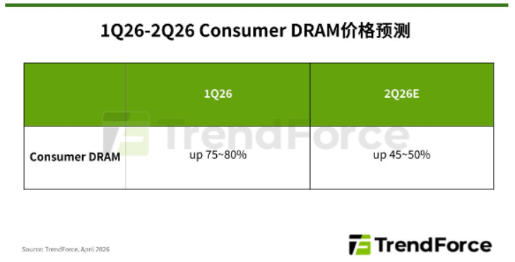 April 7, 2026 ---- 根據(jù)TrendForce集邦咨詢最新存儲器產(chǎn)業(yè)研究,大廠逐步退出成熟DDR4以下產(chǎn)品制造的策略不變,在市場供給結(jié)構(gòu)持續(xù)收斂下,過去幾個月整體價格已累積驚人漲幅。TrendForce集邦咨詢考量供給持續(xù)縮減、訂單轉(zhuǎn)移,以及成熟制程供應(yīng)商產(chǎn)能擴(kuò)張不及等因素,預(yù)估2026年第二季Consumer DRAM合約價格仍將持續(xù)季增45-50%。