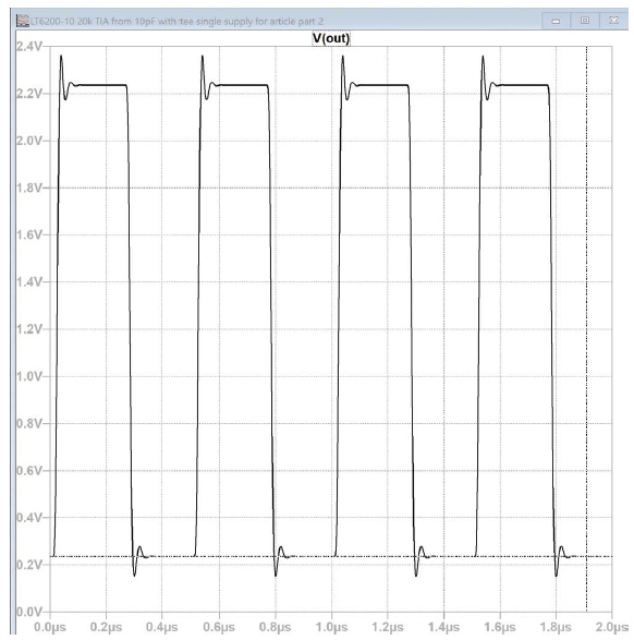 圖4.2 MHz、0到100 μA的輸入方波通過一個使用T型網(wǎng)絡(luò)的20 kΩ TIA增益電路進(jìn)行處理