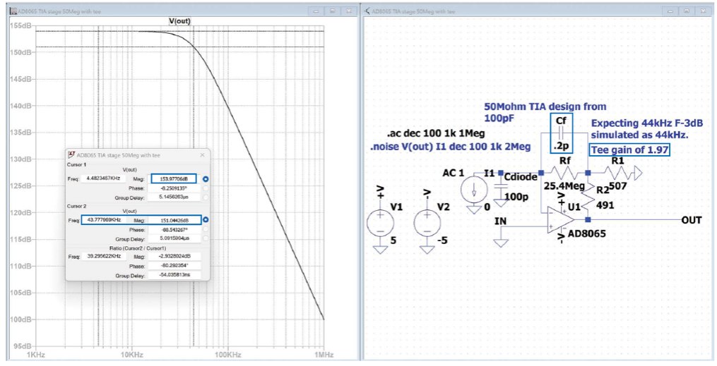 為了展示該T型網(wǎng)絡(luò)技術(shù)的應(yīng)用優(yōu)勢,我們基于一個100 pF檢波器,并使用單位增益穩(wěn)定型AD8065JFET輸入FastFET?器件,實現(xiàn)了一個50 MΩ設(shè)計。本文給出的設(shè)計方程同樣適用于這款單位增益穩(wěn)定、67 MHz GBP、超低輸入偏置電流的器件。TIA增益非常高時,最好使用JFET或CMOS輸入,以便消除輸入偏置電流經(jīng)過反饋電阻所導(dǎo)致的輸出直流失調(diào)。簡易設(shè)計需要0.1 pF Cf,此值過低,難以實現(xiàn)。若以Rf電阻的0.2 pF寄生電容為目標(biāo),則需要圖5所示的T型網(wǎng)絡(luò)設(shè)計,其中Rf元件從50 MΩ降至25.4 MΩ,相對較低的R1和R2元件提供1.97的At增益。測試仿真結(jié)果顯示,巴特沃斯響應(yīng)的F-3dB確實出現(xiàn)在預(yù)期的44 kHz。