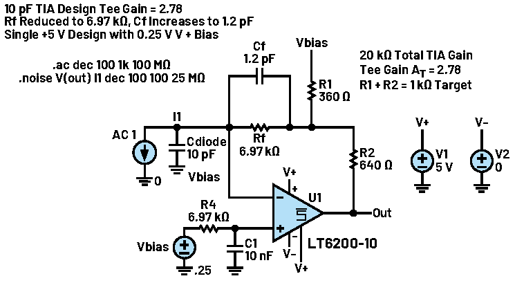 第一部分首先介紹了基本TIA設(shè)計的一種簡化補償流程,隨后通過添加一個T型網(wǎng)絡(luò),成功地將所需的補償電容提升到高于寄生電容的水平。第二部分將展示該T型網(wǎng)絡(luò)對電路環(huán)路增益(LG)圖的影響,并闡明這一影響與T型網(wǎng)絡(luò)設(shè)計代數(shù)之間的對應(yīng)關(guān)系。