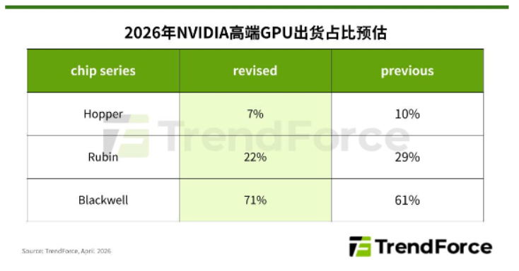 TrendForce集邦咨詢: 供應鏈尚需調校增添Rubin延遲風險,2026年Blackwell將占英偉達高端GPU出貨量超7成