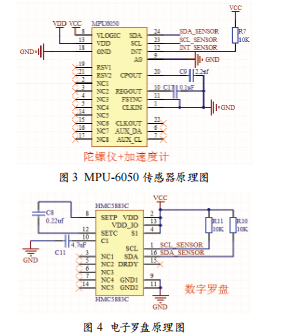 本系統(tǒng)選用InvenSense公司生產(chǎn)的結(jié)合陀螺儀與加速度計(jì)的六軸姿態(tài)傳感器MPU-6050,可與HMC5883L三軸式數(shù)字羅盤(pán)連接,并由主I2C端口以單一數(shù)據(jù)流的形式,向應(yīng)用端輸出完整的9軸融合演算數(shù)據(jù)。圖3所示是MPU-6050傳感器原理圖。圖4所示是電子羅盤(pán)的電路原理圖。