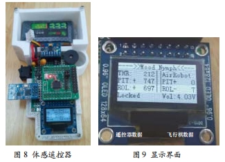 體感遙控器使用STM32F103系列的C8T6處理器作為主控芯片,圖8所示是體感遙控器的實(shí)物圖。該系統(tǒng)可搭載MPU6050傳感器和2.4G無(wú)線數(shù)傳模塊,可以采集手勢(shì)的姿態(tài)數(shù)據(jù),對(duì)其進(jìn)行姿態(tài)解算處理之后,通過(guò)2.4G無(wú)線數(shù)傳模塊將數(shù)據(jù)傳給飛行機(jī)器人,使得飛行機(jī)器人可以根據(jù)體感遙控器進(jìn)行相應(yīng)的動(dòng)作。同時(shí),體感遙控器上還有OLED顯示屏,可以顯示體感遙控器的姿態(tài)數(shù)據(jù)、飛行器的姿態(tài)數(shù)據(jù)以及飛行器電池電量等信息。圖9所示是系統(tǒng)的顯示界面圖。