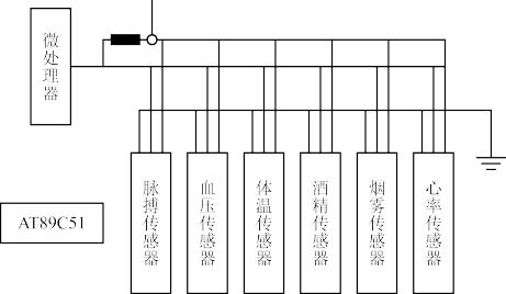 本文設(shè)計(jì)的智能車(chē)載健康監(jiān)測(cè)系統(tǒng)基于 AT89C51 微處理器,通過(guò) AT89C51 引腳與各模塊連接,實(shí)現(xiàn)模塊功能。系統(tǒng)集成有溫度傳感器、脈搏傳感器、血壓傳感器、體溫傳感器、酒精傳感器、延遲傳感器、心率傳感器等,并采用藍(lán)牙無(wú)線通信技術(shù)傳輸信息。