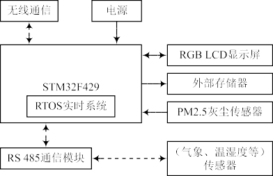 子節(jié)點(diǎn)硬件結(jié)構(gòu)主要由數(shù)據(jù)采集節(jié)點(diǎn)和監(jiān)測(cè)終端組成。數(shù)據(jù)采集子節(jié)點(diǎn)作為建筑工地環(huán)境的數(shù)據(jù)采集部分,負(fù)責(zé)將采集到的 PM2.5、溫濕度、風(fēng)速、風(fēng)向等數(shù)據(jù)通過(guò)無(wú)線通信模塊傳輸?shù)皆破脚_(tái)服務(wù)器中。監(jiān)測(cè)終端基于機(jī)智云服務(wù)器, 數(shù)據(jù)可在電腦軟件和手機(jī)APP 上查詢。數(shù)據(jù)采集子節(jié)點(diǎn)系統(tǒng)以 STM32F429 芯片作為核心處理器,外接外部存儲(chǔ)器、數(shù)據(jù)傳感器、電源、LCD 顯示屏等。整體硬件框圖如圖 2 所示。