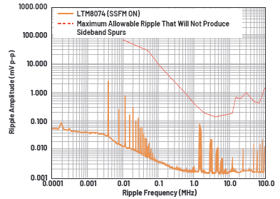 圖5.為VDDA_1P8電源軌供電的LTM8074(SSFM開啟)的輸出噪聲頻譜,以及該電源軌允許的最大紋波。