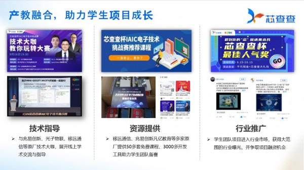 為了進(jìn)一步促進(jìn)產(chǎn)教融合,芯查查積極滲透校園,聯(lián)合iCAN大賽走進(jìn)高校,為前沿競(jìng)賽項(xiàng)目提供開(kāi)發(fā)板、開(kāi)發(fā)文檔、開(kāi)發(fā)資料等支持。作為深入校園的重要舉措,芯查查推出“校園芯星”培養(yǎng)計(jì)劃,這是電子信息行業(yè)內(nèi)首個(gè)以系統(tǒng)化形式覆蓋全國(guó)高校的專業(yè)項(xiàng)目,借此加強(qiáng)電子信息行業(yè)與高校間的密切聯(lián)系,打造優(yōu)質(zhì)的行業(yè)交流圈,培養(yǎng)國(guó)產(chǎn)集成電路應(yīng)用創(chuàng)新人才。
