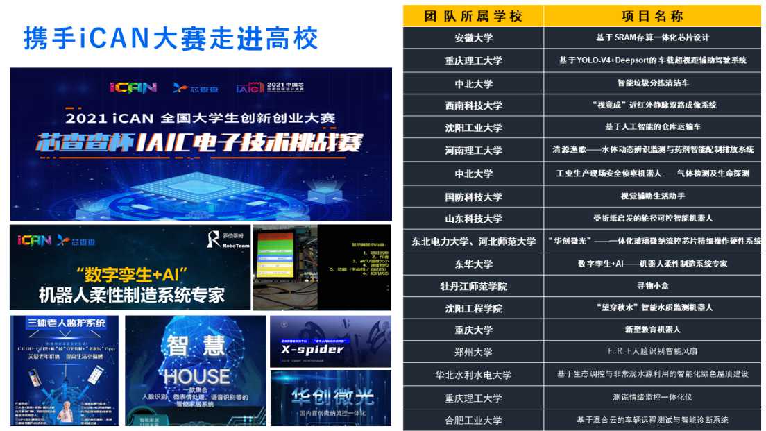 IAIC為積極響應(yīng)國(guó)家戰(zhàn)略布局,加快推進(jìn)國(guó)產(chǎn)集成電路行業(yè)的積極發(fā)展,促進(jìn)和加強(qiáng)國(guó)產(chǎn)集成電路領(lǐng)域政、產(chǎn)、學(xué)、研、用的有機(jī)結(jié)合,中國(guó)電子于2019年發(fā)起國(guó)產(chǎn)集成電路應(yīng)用創(chuàng)新設(shè)計(jì)大賽(簡(jiǎn)稱IAIC大賽),iCAN每年作為IAIC大賽高校賽道合作伙伴,與中電港聯(lián)合承辦,推進(jìn)高校賽事合作。