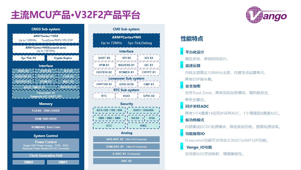 V32F2系列芯片是基于泰山400內(nèi)核(兼容ARM Cortex-M33)設(shè)計,平臺支持雙核和單核架構(gòu),主頻不低于120MHz,內(nèi)建浮點單元(FPU)和內(nèi)存保護(hù)單元(MPU),具有DSP指令集,支持各種常用功耗模式,是一款高性能多用途的通用型MCU,同時具備以下特點: