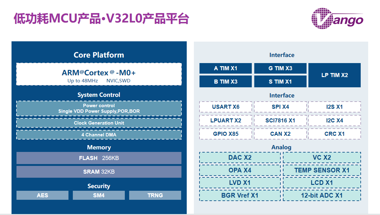 V32L0系列是一款基于泰山內(nèi)核,全新的設(shè)計理念,改進(jìn)了調(diào)試和追蹤能力以及Flash訪問的兩級流水線,減少了每條指令循環(huán)(IPC)數(shù)量,是一款具有超低功耗,寬電壓工作范圍的MCU,具備以下特點:
