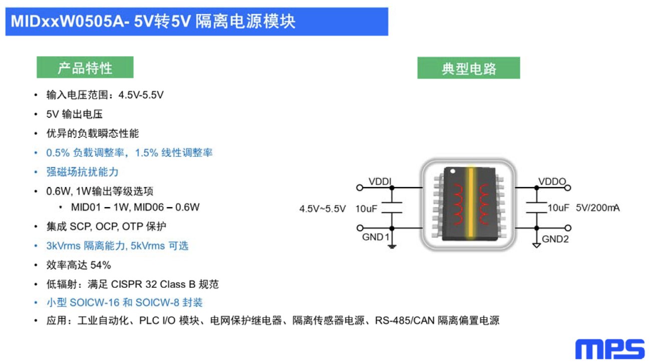 針對這一產(chǎn)品,MPS還搭配了隔離電源模塊MIDxxW0505系列。據(jù)悉,某些客戶在設(shè)計當(dāng)中,需要一個單獨的隔離供電給到其它的IO口,例如一些總線協(xié)議等;收發(fā)器里面可能需要單獨的5V轉(zhuǎn)5V的電源轉(zhuǎn)換。在這種客戶的應(yīng)用設(shè)計需求上,MIDxxW0505隔離電源模塊就非常契合。