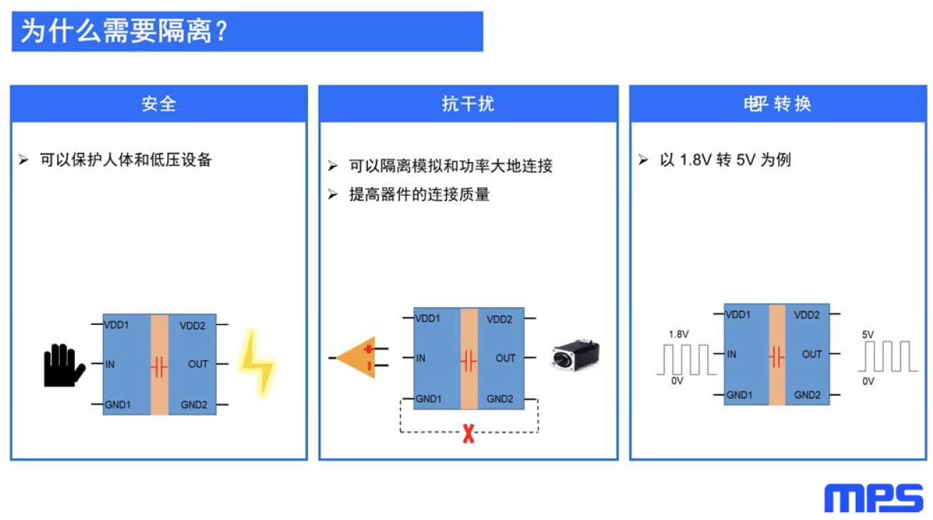 這兩種隔離技術(shù)雖然都是基于硅的,但本身的原理上并不相同。據(jù)殷亮介紹,磁隔離是基于微型變壓器,對外部會有比較強的放射,就像我們通常的變壓器一樣,對外部有EMI的干擾。因為它本身是磁場的傳輸,所以對磁抗擾度也比較低。相對來說,因為高壓電容隔離是基于高頻信號耦合到載波信號然后傳遞過結(jié)緣介質(zhì)的傳輸機制。所以它的EMI的特性會比較好,另外它是不通過磁場的這種傳輸方式,所以它的噪聲干擾度會比較好一些?;卺槍@三種技術(shù)的考量,MPS選擇了電容隔離技術(shù)這一路線來進(jìn)行自己的隔離產(chǎn)品的布局。