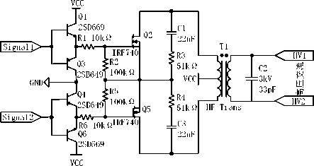 本系統(tǒng)采用兩級功率放大,設計時將TL494一對反向輸出分別接到兩對669(NPN;Fcbo=180V,払。=120V,瑚1.5A,Pw=1W)和649(PNP:Vcbo=180V,外eo=—120V,L=—1.5A,Pw=1W)中功率對管組成的推挽電路中,輸出接到后級的兩個大功率MOS管上,后級接到高頻升壓變壓器。圖3所示是本系統(tǒng)的功率放大模塊電路圖。