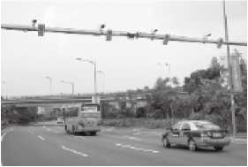 在電子車(chē)證系統(tǒng)中,對(duì)全市200萬(wàn)輛機(jī)動(dòng)車(chē)中涉及賽事的2萬(wàn)輛車(chē)的前擋風(fēng)玻璃上安裝了超高頻電子標(biāo)簽,并在賽事車(chē)輛經(jīng)常經(jīng)過(guò)的道路上方安裝了50臺(tái)超高頻讀寫(xiě)器,分布在32個(gè)斷面(采集點(diǎn))上。數(shù)據(jù)采集的斷面選擇在一段道路的中點(diǎn),這樣,采集到的車(chē)輛交通流數(shù)據(jù)基本不受紅綠燈的影響,能很好地用于計(jì)算交通擁擠程度的目的。圖3給出了一個(gè)RFID數(shù)據(jù)采集點(diǎn)的場(chǎng)景,可以看到安裝在每個(gè)車(chē)道上方的讀寫(xiě)器天線(xiàn)。