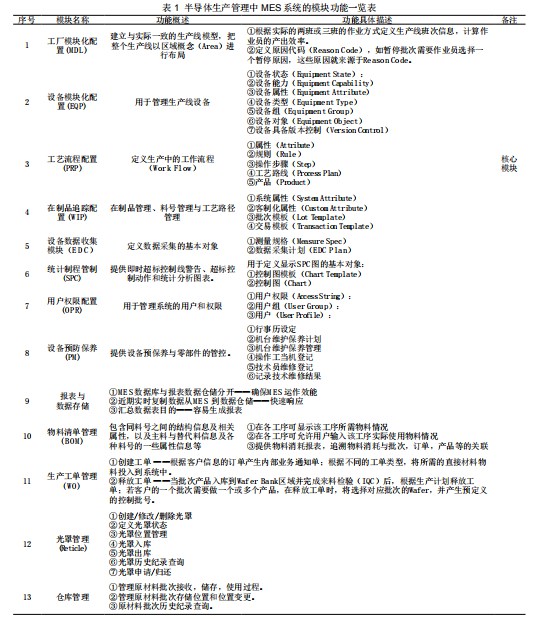 目前半導(dǎo)體業(yè)界廣泛使用的MES系統(tǒng)主要包含13個子 模塊,其各部分功能概述如表1所列。