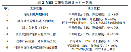 根據(jù)美國MESA協(xié)會的調(diào)查統(tǒng)計,MES實施對生產(chǎn)、 經(jīng)營、管理、產(chǎn)品等方面的提升效果顯著,表2所列是MES 實施效果統(tǒng)計分析表。