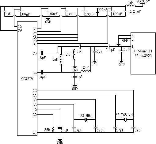 隨著RFID傳感器技術(shù)的普及率的提高,RFID標(biāo)簽廉 價(jià)并可重復(fù)使用。數(shù)據(jù)傳輸方便,并且可以基于用戶的要求處 理自定義加密算法。本系統(tǒng)RFID-ZigBee主從節(jié)點(diǎn)模塊包 括RFID標(biāo)簽、RFID讀寫(xiě)器和ZlgBee無(wú)線網(wǎng)絡(luò)。其中RFID 讀寫(xiě)器射頻模塊采用的TI公司生產(chǎn)的TRF7970A,并將 900M天線連接到讀寫(xiě)器天線端口,微處理器采用的是超低功 耗MSP430F2370,微處理器通過(guò)SPI總線接口方式連接射頻 模塊,并通過(guò)RS232連接到ZigBee終端模塊。ZigBee無(wú)線 網(wǎng)絡(luò)模塊微處理器采用的是TI公司生產(chǎn)的CC2530,它符合 2.4GHz IEEE 802.15.4標(biāo)準(zhǔn)的第二代片上系統(tǒng),提供一流的選 擇性、共存性、出色的鏈路預(yù)算、高達(dá)125。C的工作溫度和 低壓工作性能,ZigBee采用自組織網(wǎng)實(shí)現(xiàn)數(shù)據(jù)傳輸通信, CC2530的接口電路如圖1所示。