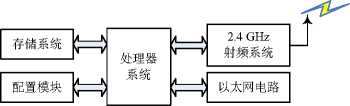 系統(tǒng)中閱讀器起到了集中器的作用,一個閱讀器管理多 個窖井蓋,然后通過該閱讀器的以太網(wǎng)接口,將數(shù)據(jù)傳輸?shù)?服務(wù)器。閱讀器的下行鏈路是2.4 GHz的射頻電路,采用全 向天線,完成窖井蓋的信息采集。上行鏈路通過以太網(wǎng)來實現(xiàn), 完成系統(tǒng)和服務(wù)器之間的連接。閱讀器的結(jié)構(gòu)如圖3所示。