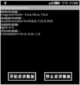 SOS指定了一個(gè)可以發(fā)送和接收數(shù)據(jù)的網(wǎng)絡(luò)地址,http:// IP地址:8080/52nSOSv3/sos,具體的IP地址和端口視具體網(wǎng)絡(luò) 環(huán)境改變,手機(jī)端軟件每隔一段時(shí)間(1 s、5 s或10 s)便會(huì)自動(dòng) 將收到的實(shí)時(shí)數(shù)據(jù)以標(biāo)準(zhǔn)化的數(shù)據(jù)傳輸XML文檔發(fā)送到SOS 服務(wù)器。當(dāng)服務(wù)器接收到post請(qǐng)求,便調(diào)用SOS的Servlet和監(jiān) 聽器類,對(duì)XML代碼詳細(xì)解析,當(dāng)判斷出此XML是觀測到的傳 感器數(shù)據(jù)信息,將自動(dòng)持久化到數(shù)據(jù)庫,并反饋插入成功的標(biāo)識(shí)和 信息到客戶端。當(dāng)用戶點(diǎn)擊此軟件客戶端,就會(huì)進(jìn)入如圖5所示的 主界面,用戶可以觀測到各種傳感器數(shù)據(jù)的變換,并通過menu鍵, 選擇發(fā)送數(shù)據(jù)或停止發(fā)送數(shù)據(jù)。