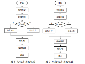 本系統(tǒng)采用人工按鍵的操作方式,實現公交車對站名顯示功能。當公交車到達某一站時,司機或乘務人員只需按動按鍵,就可以使單片機控制顯示模塊在液晶屏上顯示站名。并將所到的車站的站號通過串口通訊的方式傳送給扶手端的單片機,扶手端的單片機接收站號與存儲器中存儲的站名進行匹配,最終顯示在扶手端的液晶顯示屏上。系統(tǒng)框圖如圖1所示。