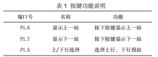 系統(tǒng)的軟件主要分為司機控制臺程序和從端扶手端程序。司機控制臺程序主要包括 :按鍵處理程序、顯示程序和站名傳輸程序 ;從端扶手端程序主要包括 :站名接收程序及站名顯示程序。司機端控制臺按鍵端口定義及功能對應如表1所示。司機端系統(tǒng)上電后,首先對各端口和寄存器進行初始化,接下去判斷有無按鍵按下,如果有收到數據,處理后,顯示報站。具體的程序流程圖如圖 6 所示。首先要將站名信息按照編號分別存儲在司機控制端和扶手端,在程序中以 j 的值來代表站點序號。