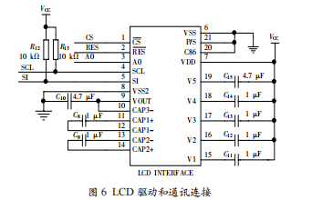 本設(shè)計(jì)選用了128×64點(diǎn)陣的LCD顯示模塊作為冰箱系統(tǒng)顯示屏,此模塊采用的COG工藝(ChipOnGlass),芯片直接邦定在玻璃上,這種安裝方式可以大大減小模塊的體積。選用的芯片是S1D15605最大支持132×65點(diǎn)陣,設(shè)置為1/64duty,1/9bias,IC內(nèi)部有DCDC升壓電路,只需VDD5V供電和接口電路即可,通信使用SPI串口或者8位并口和SM89516A連接,模塊是FPC連接方式方便易插接,IC有內(nèi)部溫度補(bǔ)償功能可以在不同溫度環(huán)境下實(shí)現(xiàn)良好的顯示效果接口電路如圖6所示。