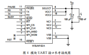設(shè)計(jì)中可用程序采用中斷掃描方式接收模塊消息,一旦消息到達(dá)就調(diào)用串口接收程序來(lái)接收和處理命令。UART 接口波特率可調(diào),其他參數(shù)固定為 8 位數(shù)據(jù)位、1 位停止位、無(wú)奇偶校驗(yàn),模塊不使用傳統(tǒng)的 RTC/CTS 硬件流控制,而是使用BUSY 和 PAUSE 兩根信號(hào)線提供以數(shù)據(jù)包為單位的流量控制。模塊提供的最大波特率為 4.5 Mb/s,在此波特率下有效數(shù)據(jù)發(fā)送速率約為 2 Mb/s,接收速率約為 3 Mb/s,模塊接口電路如圖 4 所示。