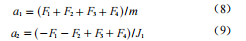 Ji 是對于軸的轉(zhuǎn)動慣量,C 是力與力矩的比例因子。a1 表示了在 Z 軸方向上的加速度,a2、a3 表示輸入的側(cè)傾和俯仰,a4 表示了一個旋轉(zhuǎn)力矩。因此運動方程可變?yōu)?:
