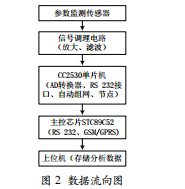 匯聚節(jié)點核心模塊由主控MCUSTC89C52和ZigBee通信模塊CC2530組成,普通節(jié)點由CC2530外圍連接若干種針對不同監(jiān)測項目的傳感器,通過這些傳感器實現(xiàn)對不同測試環(huán)境可任意組合的無線傳感網絡監(jiān)測系統(tǒng),不同水環(huán)境可選擇不同的傳感器組;ZigBee網絡管理和數(shù)據(jù)收發(fā)主要由CC2530模塊負責,利用Z-Stack協(xié)議棧的API接口,模塊實現(xiàn)了ZigBee無線網絡的動態(tài)組網、網絡自恢復、數(shù)據(jù)發(fā)送和數(shù)據(jù)接收等任務;傳感器模塊的接口按照標準的工業(yè)通信接口設計,保證了設計的標準化和平臺化,具有良好的可擴展性和可移植性。系統(tǒng)流程圖如圖2所示。參數(shù)檢測傳感器所采集的數(shù)據(jù)通過信號調理電路,若為數(shù)字信號則直接送至CC2530單片機;若為模擬信號則需先經信號調理電路放大、濾波,再發(fā)送給CC2530的內置AD轉換器。CC2530節(jié)點自動組網絡通過RS232接口與匯聚節(jié)點中的主接芯片STC89C52連接。匯聚節(jié)點接GSM模塊,該模塊通過GPRS將數(shù)據(jù)以無線方式發(fā)送至上位機,上位機再將數(shù)據(jù)存儲并分析。