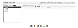 在已選題型列表中選擇題型,點擊【添加試題】按鈕,進入“選擇試題”頁面,(如圖 4 所示):在“選擇試題”頁面首先選中試題分類,系統(tǒng)將列出分類下對應題型的所有試題,勾上試題前的復選框選中試題,點擊【確定并關閉】或【確定并返回】按鈕。即完成了一份符合設計要求的試卷就完成了。