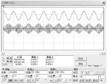 開(kāi)啟仿真后可以可在雙蹤示波器上看到低頻調(diào)制信號(hào)與 普通調(diào)幅信號(hào)波形對(duì)比圖,如圖2所示。