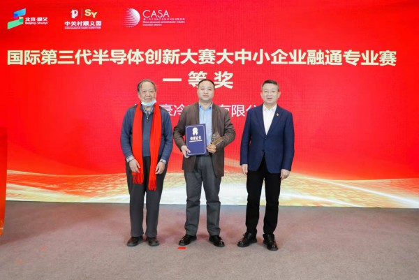 12月30日下午,在2021年第三代半導(dǎo)體創(chuàng)新發(fā)展峰會上,中國科學(xué)院院士、北京大學(xué)教授甘子釗,順義區(qū)委副書記、區(qū)長龔宗元,中國工程院院士、北京有色金屬研究總院教授黃小衛(wèi),北京市經(jīng)濟(jì)和信息化局副局長姜廣智,科技部高新技術(shù)司材料處調(diào)研員曹學(xué)軍,北京市順義區(qū)經(jīng)濟(jì)和信息化局局長、中關(guān)村順義園管委會主任蘭雄景分別為獲獎選手頒獎。
