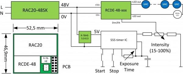 針對(duì)不需要調(diào)光控制的UV消毒應(yīng)用,可以使用 AC/DC 恒流 LED 驅(qū)動(dòng)器。RECOM 提供低成本、安全認(rèn)證的 20W 恒流 LED 驅(qū)動(dòng)器,高度僅 13 毫米,因此 UVC LED PCB 和驅(qū)動(dòng)器可以完整且輕松地安裝到小型 UVC 照射室的天花板上:
