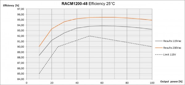 一個(gè) 1200W 的 AC/DC 轉(zhuǎn)換器足以滿足許多應(yīng)用的需要,可以替代多個(gè)較小的轉(zhuǎn)換器。單個(gè)大功率 AC/DC 轉(zhuǎn)換器的運(yùn)行功率高于多個(gè)較小轉(zhuǎn)換器的運(yùn)行功率。盡管單個(gè)電源都盡可能保持較低的內(nèi)部功耗,但多個(gè)電源的內(nèi)部功耗仍會(huì)疊加起來。例如,如果一個(gè)設(shè)備機(jī)架裝了十二個(gè)獨(dú)立的 100W 電源,每個(gè)電源的內(nèi)部功耗為 2W,總損耗加起來為 24W。相較之下,一個(gè)大型轉(zhuǎn)換器的損耗僅 2W。如果齒輪托盤連續(xù)運(yùn)行,每年可節(jié)省約 200 kWh。RACM1200 的空載功耗為 0.75W(主輸出關(guān)閉,輔助輸出保持運(yùn)作),滿足「80 Plus Platinum」和「Ecodesign Lot 6」的效率要求。