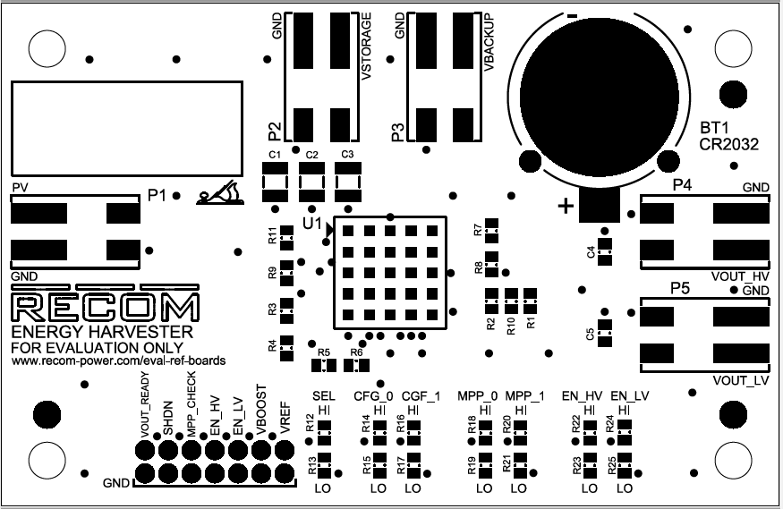 REH-3.31.8-EVM-1可以輕松且快速地評(píng)估 REH-3.31.8 能量收集模塊。評(píng)估板具備所有必要的即插即用連接器來(lái)連接能源、儲(chǔ)能元件、雙輸出電壓和外部備用電池。PCB保留了節(jié)省空間的 CR2032 電池座的焊盤(pán),可在需要時(shí)使用板載備用電池。