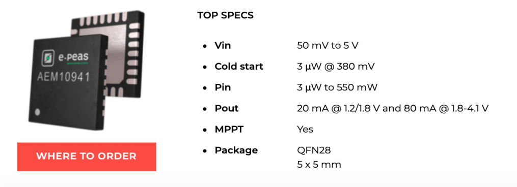 e-peas 的太陽(yáng)能收集 IC 解決方案AEM10941 是一種集成能量管理電路,可從多達(dá)七節(jié)太陽(yáng)能電池板汲取直流電源并同時(shí)將能量存儲(chǔ)在可充電元件中,為系統(tǒng)提供兩個(gè)獨(dú)立的調(diào)節(jié)電壓。太陽(yáng)能收集器 AEM10941可以延長(zhǎng)電池壽命,最終在廣泛的無(wú)線應(yīng)用中消除一次性電池儲(chǔ)能元件,例如工業(yè)監(jiān)控、地理定位、家庭自動(dòng)化、電子健康監(jiān)控和無(wú)線傳感器節(jié)點(diǎn)等。
