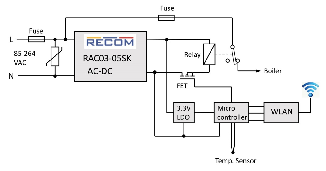 氣體泄漏、噪聲和 IR 溫度傳感器一般是安裝在天花板上,照明電路提供合適的交流電源 115V、230V 或 277VAC,即480V 三相系統(tǒng)中的相電壓。使用遠(yuǎn)程 LPWAN 無(wú)線電(LoRa、sigfox、KNX-RF 等)或蜂窩網(wǎng)絡(luò)(5G、NB-IoT、GSM 等)進(jìn)行數(shù)據(jù)傳輸。由于功率要求通常較低,因此RECOM的通用輸入、5W板載 RAC05-K/277 是一個(gè)不錯(cuò)的選擇。