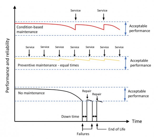 大多數(shù)的流程為了更好地保持生產(chǎn)量依靠定期的「預(yù)防性」維護(hù)和檢查。簡(jiǎn)單的機(jī)械系統(tǒng)要定期更換過(guò)濾器和機(jī)油、檢查軸承或調(diào)整間隙等。在電子產(chǎn)品方面,可能會(huì)更換正常運(yùn)作但老舊的保險(xiǎn)絲、避雷器和電解電容器。決定何時(shí)采取行動(dòng)并不容易,太晚執(zhí)行可能導(dǎo)致破壞性故障,太早更換可能將好的零件丟棄造成不必要的工作和成本浪費(fèi)。因此時(shí)間安排是一個(gè)挑戰(zhàn),根據(jù)使用時(shí)間、使用情況或只是靠直覺(jué)和經(jīng)驗(yàn)來(lái)安排工作。高可用性系統(tǒng)通常會(huì)進(jìn)行故障模式、影響及危害性分析 (FMECA),在科學(xué)的基礎(chǔ)上預(yù)測(cè)故障頻率及影響。這樣可以盡可能減少零件庫(kù)存并在適當(dāng)?shù)臅r(shí)間安排維護(hù)工作。