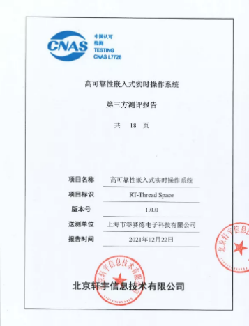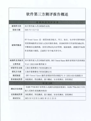 日前,RT-Thread Space 高可靠性嵌入式實(shí)時(shí)操作系統(tǒng)完成北京軒宇信息技術(shù)有限公司(以下簡(jiǎn)稱“軒宇信息”)第三方測(cè)評(píng),測(cè)試結(jié)論表明 RT-Thread Space 嵌入式實(shí)時(shí)操作系統(tǒng)滿足GJB7718-2012《軍用嵌入式操作系統(tǒng)技術(shù)要求》和 GJB7706-2012《軍用嵌入式操作系統(tǒng)測(cè)評(píng)要求》的規(guī)定,功能正確,通過(guò)評(píng)測(cè)。