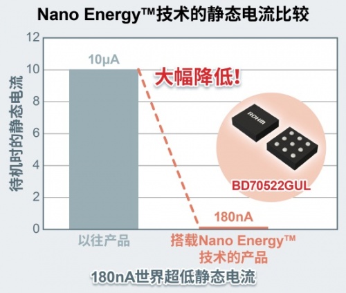 Nano Energy是以物聯網領域的關鍵詞“紐扣電池十年驅動”為目標,在ROHM的垂直統(tǒng)合型生產體制下,凝聚“電路設計”、“布局”和“工藝”三大先進模擬技術優(yōu)勢而實現的超低靜態(tài)電流技術。